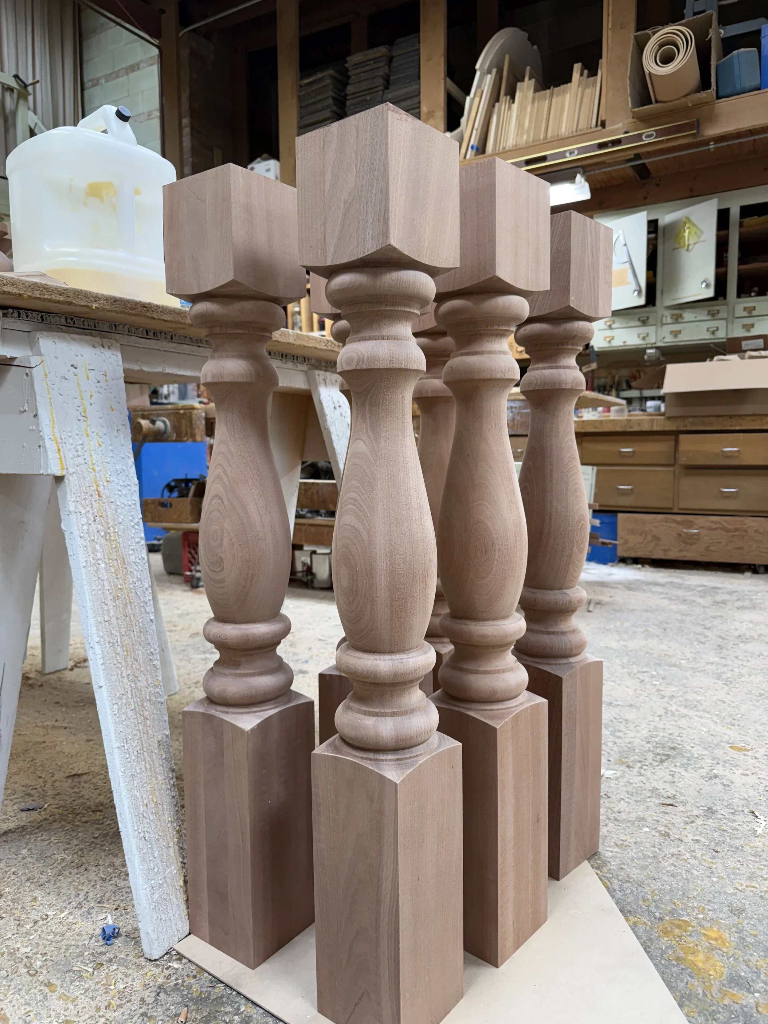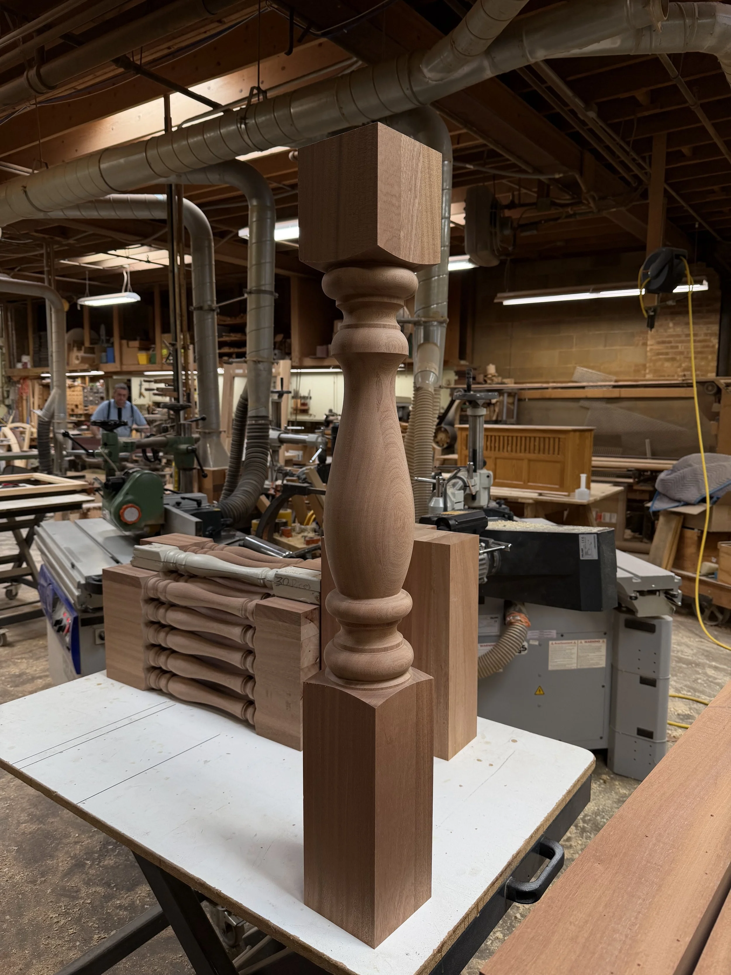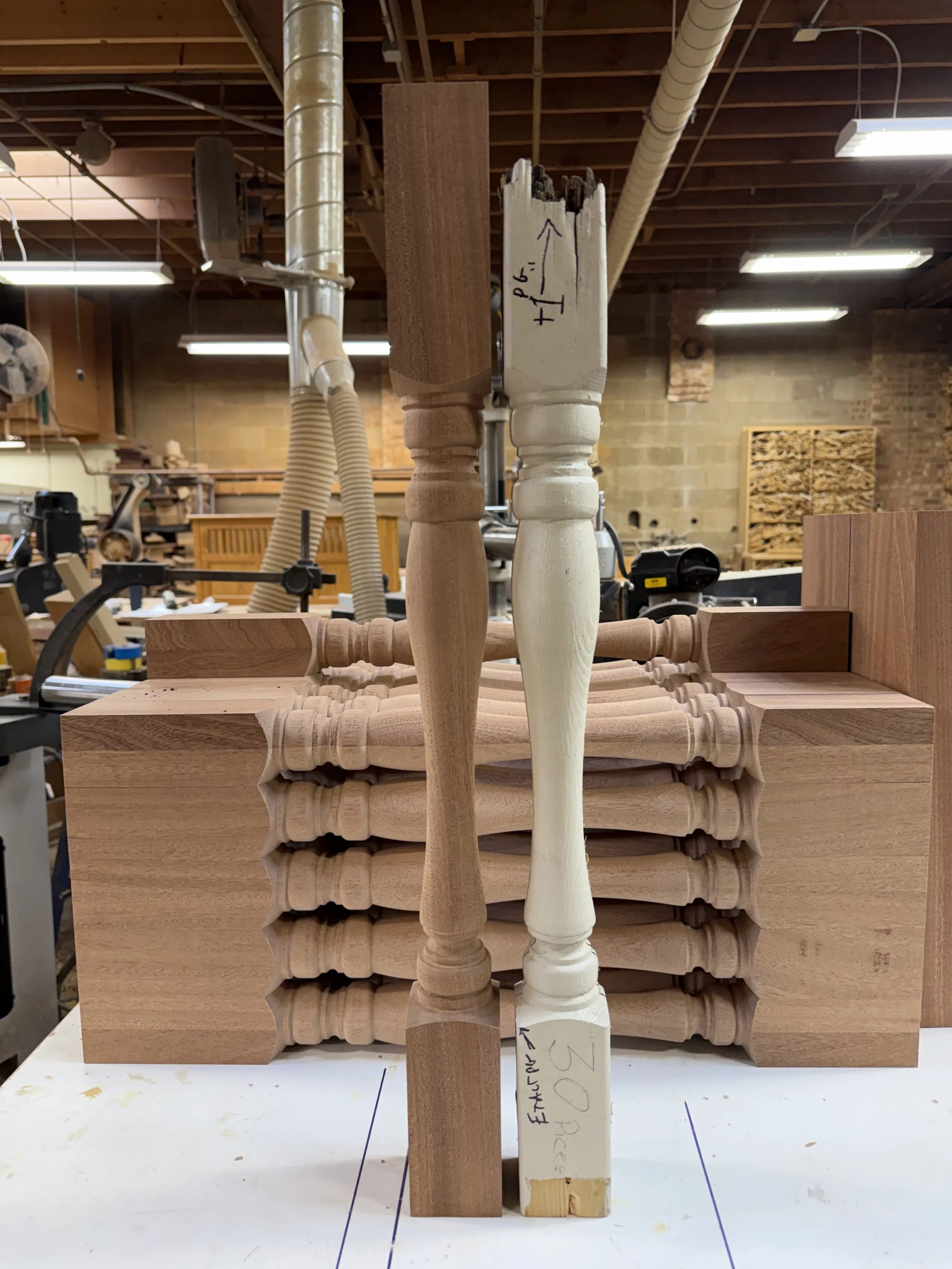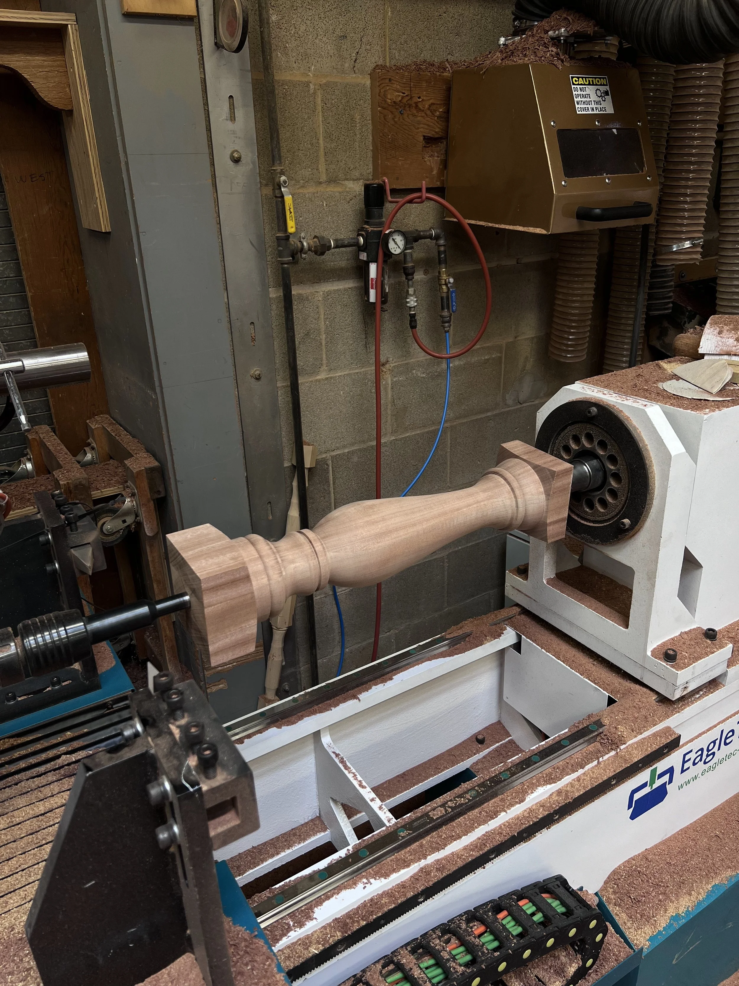 Our CNC lathe can create custom spindles, newel posts, column bases, & caps as well as many more designs.
